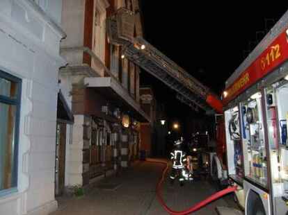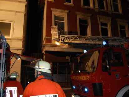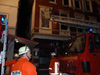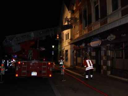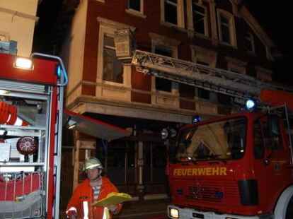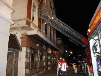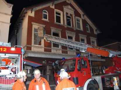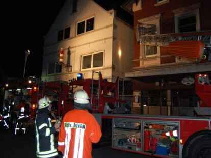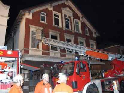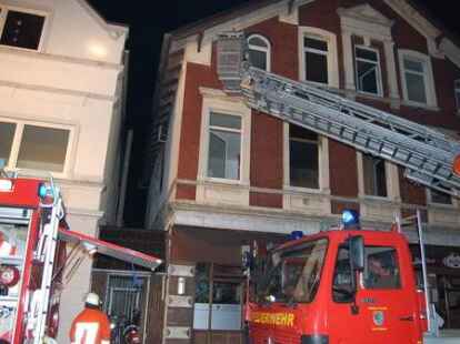 In der Nacht zu Pfingstmontag gegen 1.30 Uhr hat die Nordenhamer Ortsfeuerwehr einen 44 Jahre alten Nordenhamer aus einer brennenden Wohnung in der Herbertstraße in der Innenstadt unter schwerem Atemschutz gerettet. Der alleinstehende Mieter ist mit lebensgefährlichen Rauchgasvergiftungen zunächst in die Wesermarsch-Klinik Nordenham gebracht und dann mit einem Rettungshubschrauber in eine Hamburger Spezialklinik geflogen worden. Vier weitere Bewohner des älteren Wohn- und Geschäftshauses und zwei Besucher waren rechtzeitig ins Freie gelangt. Die Gaststätte im Erdgeschoss war zum Zeitpunkt des Feuerausbruchs geschlossen. Die Polizei schätzt den Schaden vorläufig auf etwa 50 000 Euro. Die Brandursache ist noch nicht geklärt. Die Feuerwehr gelangte mit schwerem Atemschutz durch das Treppenhaus zur brennenden Wohnung. Die eingesetzte Drehleiter diente als zweiter Fluchtweg. Bilder: Horst Lohe