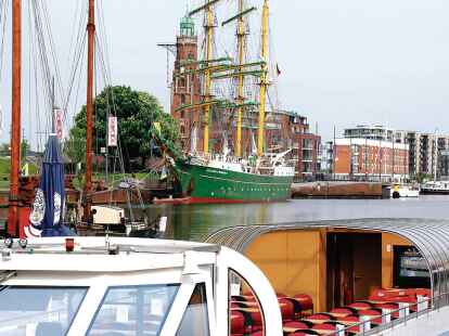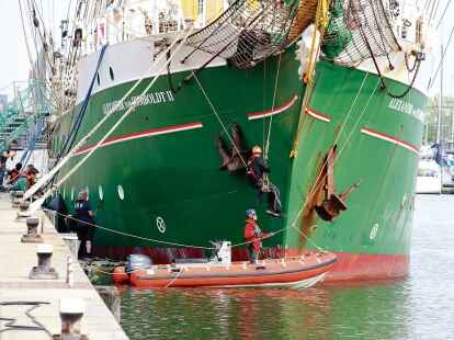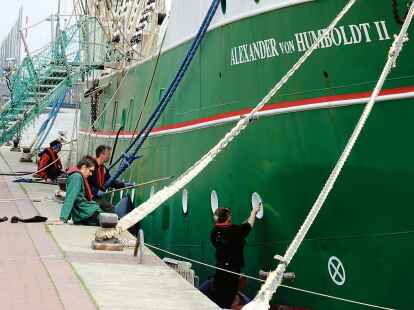 Wenn die „Alexander von Humboldt II“ ihren Heimathafen an der Weser anläuft, dann braucht sich der grüne Dreimaster über zu wenig Aufmerksamkeit nicht zu beklagen. Am Liegeplatz im Neuen Hafen, direkt gegenüber des Zoos, bleiben immer wieder Leute stehen und sehen zu, wenn Mitglieder der Stammcrew hoch oben in den Masten arbeiten oder, wie hier, für Ausbesserungsmaßnahmen am Schiffsrumpf den Pinsel mit der grünen oder weißen Farbe schwingen. Unsere Aufnahmen entstanden während der letzten Stippvisite des Schiffe vor rund zwei Wochen. Nach Bremerhaven zurückkehren wird die „Alex II“ erst zu den Maritimen Tagen Mitte August.