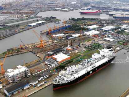 Für dieses außergewöhnliche Schiff ist der Pressefotograf extra in die Luft gegangen: Seit vorigen Donnerstag liegt die „Transgas Force“ an der neuen Westkaje, soll von der Lloyd Werft auf ihren Einsatz vorbereitet werden – ein Spezialauftrag. Die „Transgas Force“ ist nichts anderes als ein Gas-Terminal im Wasser. Die Bundesregierung hat den knapp 300 m langen „Tanker“ gechartert, um sich weiterhin unabhängig von russischem Gas zu machen. Voraussichtlich zweieinhalb Monate soll es dauern, bis die Arbeiten am Schiff abgeschlossen sind. Dann verholt es von Bremerhaven aus ins niedersächsische Stade zum dortigen LNG-Terminal.