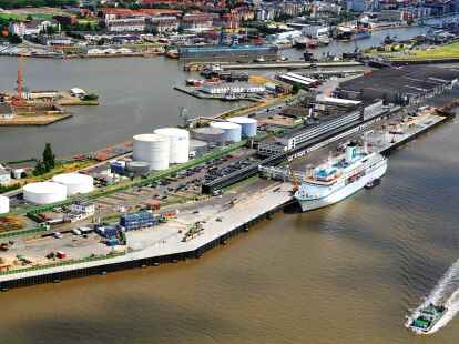 Bremerhavens neue Columbuskaje nimmt immer weiter Gestalt an. Vor die alte Anlegestelle hat man im Auftrag der Hafenmanagementgesellschaft Bremenports eine neue Spundwand 20 Meter in die Weser hinein gerammt. Das ist, aus der Luft betrachtet, der helle Streifen, der sich vor dem Abfertigungsterminal und dem alten Columbusbahnhof mit Aussichtsterrasse entlangzieht. Die Bauarbeiten liegen laut Bremenports im Zeitplan. Unser Bild entstand, als gerade die „Deutschland“ Passagiere an Land gehen ließ und neue Fahrgäste aufnahm. Das ehemalige ZDF-Traumschiff aus der gleichnamigen Fernsehserie zählt zu den kleineren Kreuzlinern, die in Bremerhaven festmachen.
