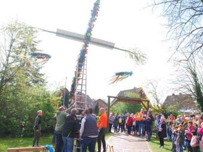 Jeverland - Der Mai ist gekommen - die Leute wollen raus: Nach zwei Jahren Pause haben sich in den Dörfern die Menschen des Jeverlands wieder zu den traditionellen Maifeiern versammelt und den Wonnemonat mit fröhlichen Liedern und dem Aufstellen bunt geschmückter Maibäume begrüßt. Chöre und Kindergärten begleiteten den Kraftakt mit Gesang und Aufführungen, die Dorfgemeinschaften als Initiatoren hatten für kühle Getränke gesorgt und den Grill angeworfen.