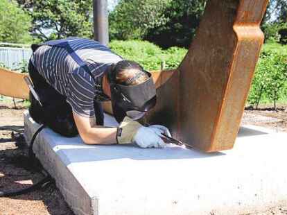 EDEWECHT - Sie hat einen steinernen Ankerplatz erhalten, der die geografischen Koordinaten 53 Grad, 6 Minuten Nord und 7 Grad 57 Minuten Ost aufweist – die riesige Skulptur, die am Donnerstag an der Landesstraße 831 kurz nach der Ortsausfahrt Edewecht Richtung Süddorf installiert wurde. Am Kleinbahnwanderweg auf einem Parkplatz für Radwanderer direkt neben der Vehne steht sie nun – das Industriedenkmal „Edewechter Helgen“, das in Form gebrachte Heimatgeschichte beinhaltet.
