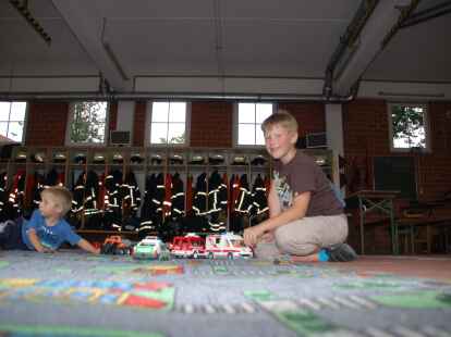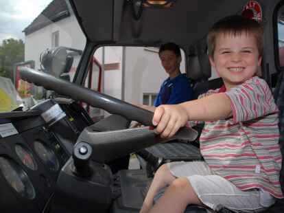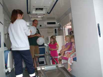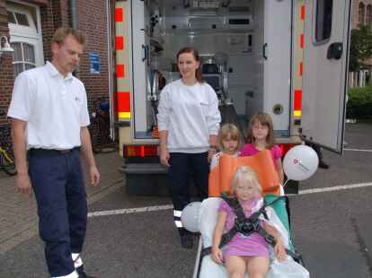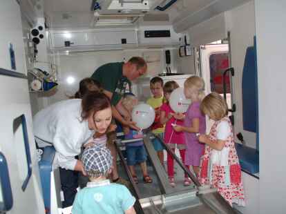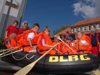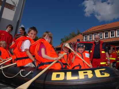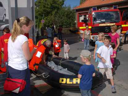 Alle Mann ins Boot: Bei der DLRG-Ortsgruppe wurden unter der Leitung von Heino Fastje (hinten, Bildmitte) Schwimmwesten angezogen. Auch Feuerwehr und Malteser-Hilfsdienst hatten einiges zu bieten.