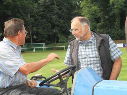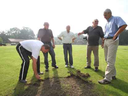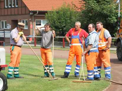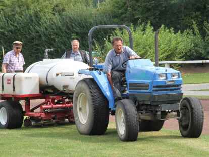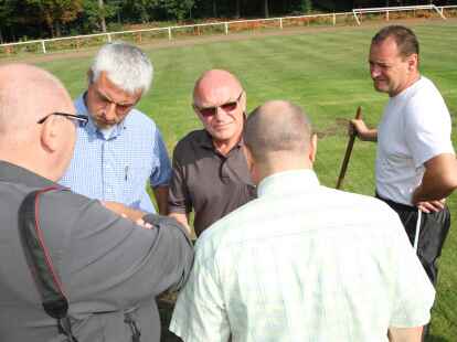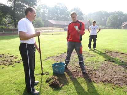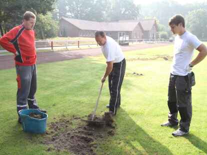 In mühevoller Handarbeit haben (von links) Keno Hagedorn, Bastian Flege und Platzwart Uwe Kricke die lockeren Grassoden abgeharkt.