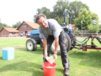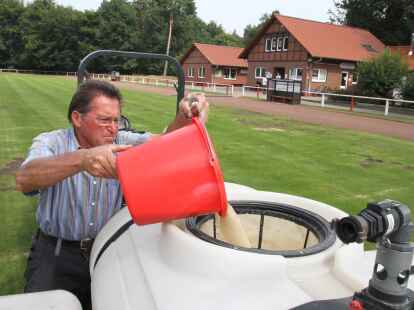 Großeinsatz: Nils Schlüter (vorn) wässert den Rasen; im Hintergrund bringt Heiner Garms die Nematoden ein.