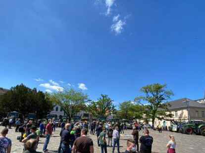Gegen 11:30 Uhr ist es soweit: Acht Trecker kommen angefahren, einer hat ein Pfluggerät angekoppelt. Oeltjen lotst ihn zu einer Wiese rechts vom Gebäude. Über das Gras und zwischen den Bäumen hindurch fährt er an der Schranke vorbei, die verhindern soll, dass unbefugte Fahrzeuge auf das Gelände fahren. Die anderen sieben Trecker positionieren sich links und rechts der Zufahrt und sperren somit die Hindenburgstraße.