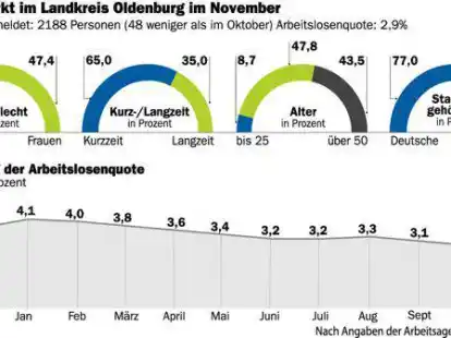 Die Arbeitslosenquote im Landkreis Oldenburg beträgt 2,9 Prozent. Damit liegt sie einen Prozentpunkt unter dem November des Vorjahres.