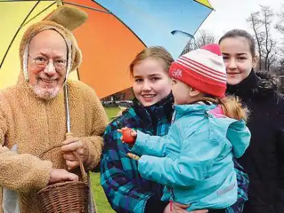 Osterhase kommt mit knallbuntem Regenschirm