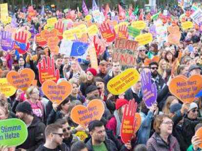 Kurz vor der konstituierenden Sitzung des Bundestags haben sich am Sonntag rund 12 000 Menschen in Berlin an einer Demonstration unter dem Motto „Gegen Hass und Rassismus im Bundestag“ beteiligt. „Die Geschichte hat uns gelehrt, zu was Hass und Rassismus führen können. Ich fordere Abgeordnete jeder Richtung auf, es uns gleichzutun und gemeinsam für unsere demokratischen Grundwerte einzustehen“, sagte der 23-jährige Initiator Ali Can. Die Veranstalter hatten im Aufruf erklärt: „Am 24. Oktober werden Rechtsextreme und Rassisten auf den Stühlen des Bundestags Platz nehmen, als Mitglieder der neuen AfD-Fraktion.“ Daraufhin bezeichnete die AfD die Demonstration als „Anschlag auf die Demokratie“. Der Bundestag konstituiert sich am Dienstag.