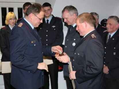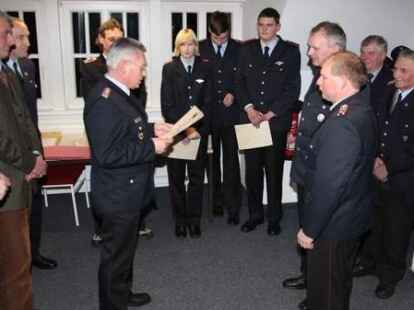 Bilanz zog die Freiwillige Feuerwehr Düngstrup bei Wildeshausen. Ortsbrandmeister Kurt Hagelmann berichtete von 297 Einsatzstunden im Jahr 2009. Bilder: Stefan Idel