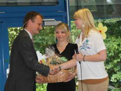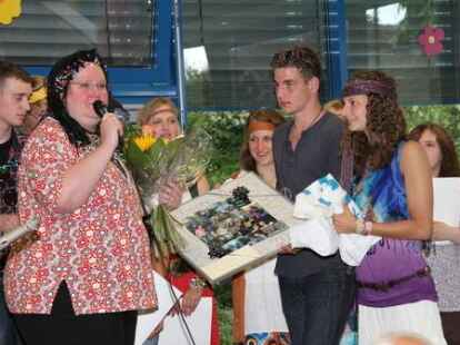 Schulleiter Jan Pössel bedankt sich bei Sekretärin Dörthe Biedermann mit Blumen.