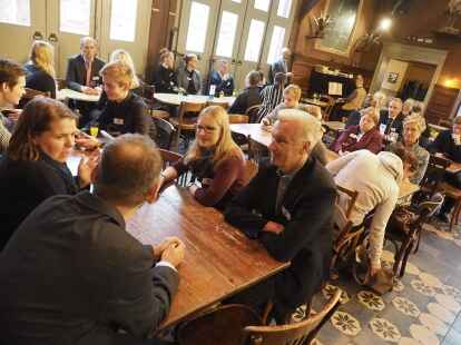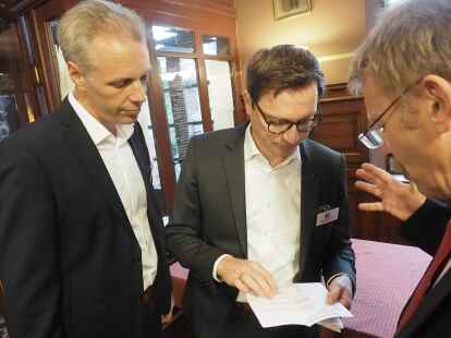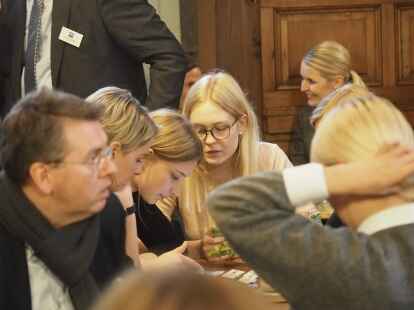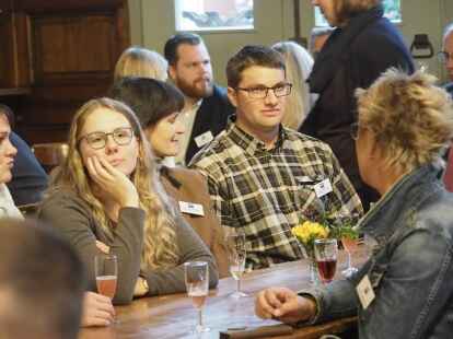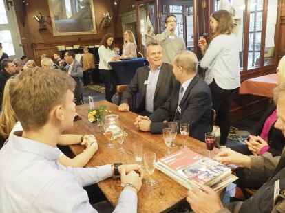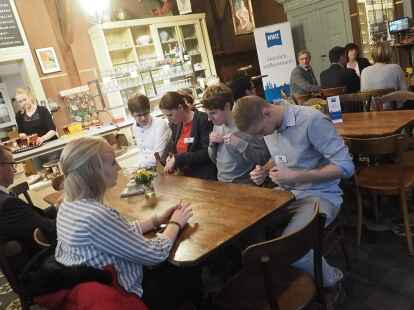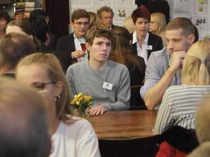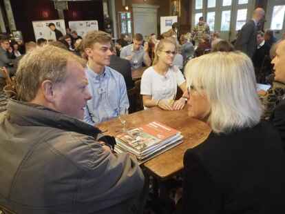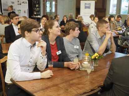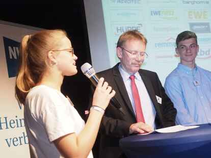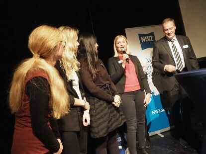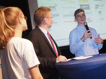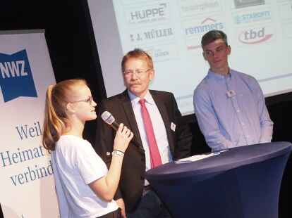 Zum ersten Mal nahmen in diesem Jahr Schüler anstelle der Jurymitglieder an der Diskussionsrunde teil. Pia Mählmeyer und Erik Ahlhorn (beide zwölfter Jahrgang am Alten Gymnasium Oldenburg) stellten sich den Fragen von NWZ-Wirtschaftschef Rüdiger zu Klampen. Begleitet wurden die Schüler von ihrem Lehrer Ludger Hillmann.